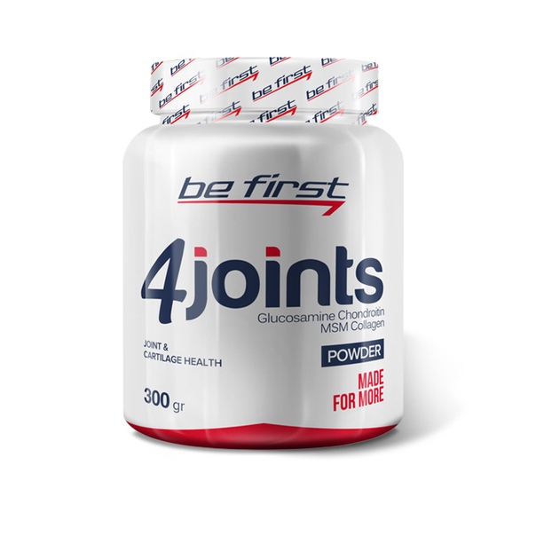 Be First 4joints Powder – комплекс натуральных веществ, предназначенных для питания, восстановления и укрепления суставов, а также соединительных тканей. Активными компонентами комплекса являются глюкозамин, хондроитин, коллаген, метилсульфонилметан (MSM) в наиболее оптимальном соотношении. Смесь усилена витамином С и обладает приятным вкусом. Комплекс легко растворим в воде.