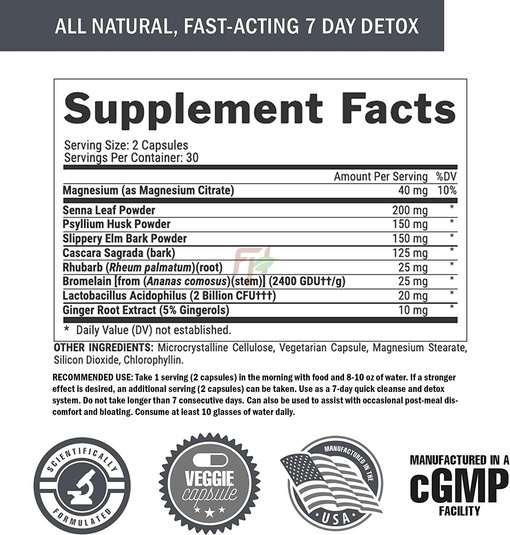 Принимать по 1 порции (2 капсулы) утром во время еды, запивая 8-10 унциями воды. Если желателен более сильный эффект, можно принять дополнительную порцию (2 капсулы). Используйте в качестве 7-дневной системы быстрого очищения и детоксикации. Не принимайте дольше 7 дней подряд. Может также использоваться для облегчения периодического дискомфорта после еды и вздутия живота. Употребляйте не менее 10 стаканов воды в день.