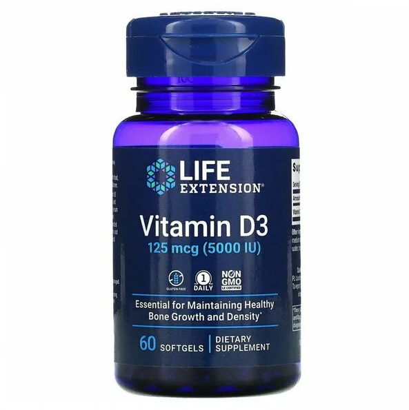 Эта добавка с витамином D3 обеспечивает 125 мкг (5000 МЕ) витамина D3 в виде холекальциферола в 1 капсуле. Рекомендуем сдать анализ крови на 25-гидрокси-витамин D через 3 месяца применения данного препарата, чтобы оценить правильность дозировки и скорректировать ее. Его оптимальный уровень в крови должен составлять 50–80 нг/мл в течение всего года.